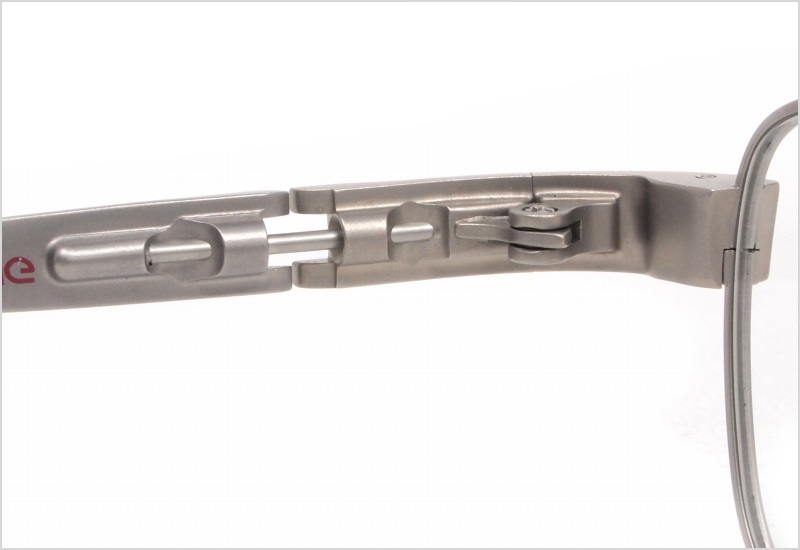 ベータチタンを使用し、丁番の前側とテンプルの後ろ側で二つの折り返しを作ったこちらの機構。